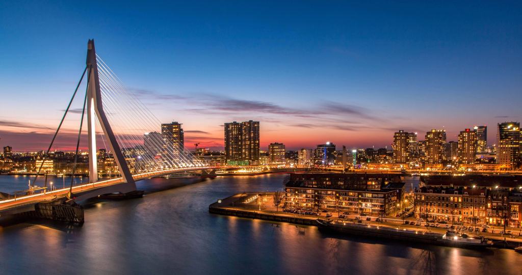 De Erasmusbrug, verlicht als een wachtersilhouet over de stad.