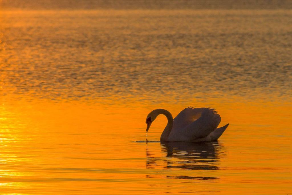 De zwaan glijdt zacht door het gouden water, gevangen in de stilte van de ondergaande zon.