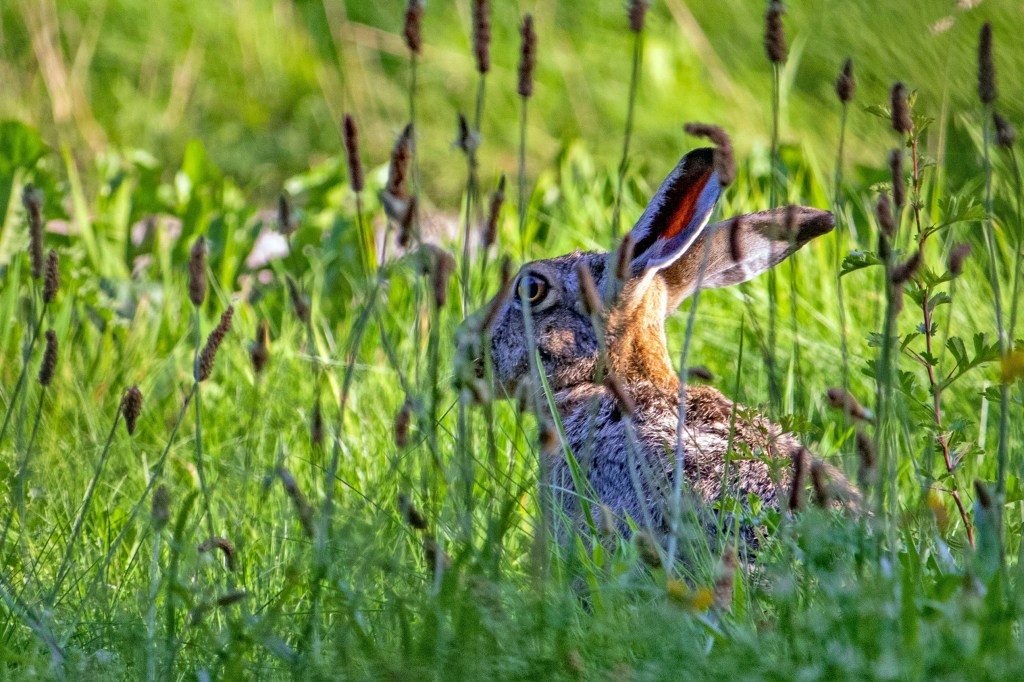 Verscholen in het hoge gras, vertrouwt de haas op zijn stilte.